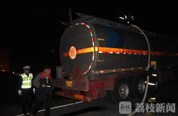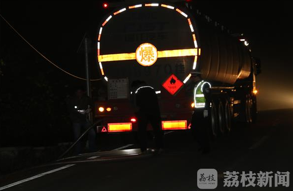 约23时,安监局危化品处置库专家组赶到现场进行指导决定实施驳载,既有利于降低货主经济损失,也不会对周围环境造成不利影响。在警车开道和收尾下,将危化品泄露的车辆移至星甸后圩静脉产业园一处小山坡上,在消防队员的严密监控下,利用自然坡度实施驳载。