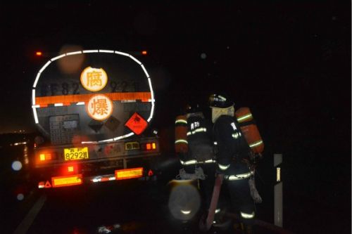 11月19日22时36分,黄石消防支队接到报警称:大广高速往大冶收费站两公里处一装载二甲苯货车轮胎着火。