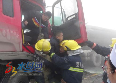 水母网12月2日讯(YMG记者 武峻平 通讯员 孙艳梅 摄影报道)11月30日早上,莱州出现雾霾天气,严重时段能见度不足100米。上午9时39分,莱州消防大队接到报警称:莱州市老206线往平里店方向2公里处发生车祸,一货车司机被困驾驶室。