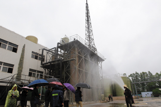 佛山市环境突发事件演练,企业救援队伍对泄漏酸雾进行压制